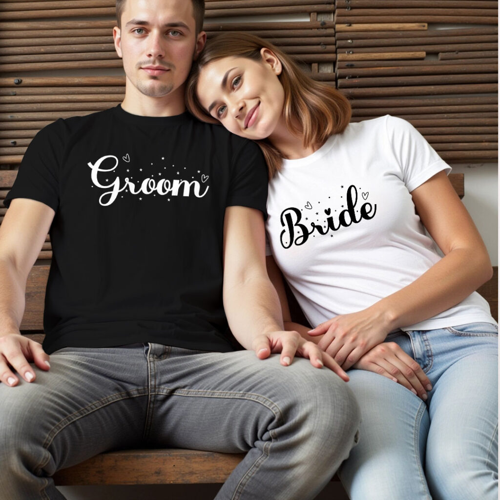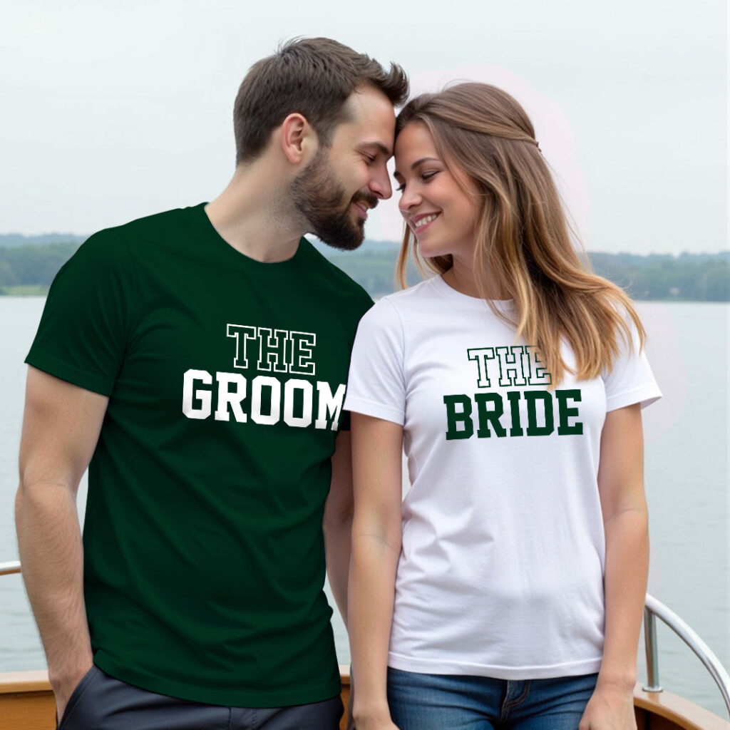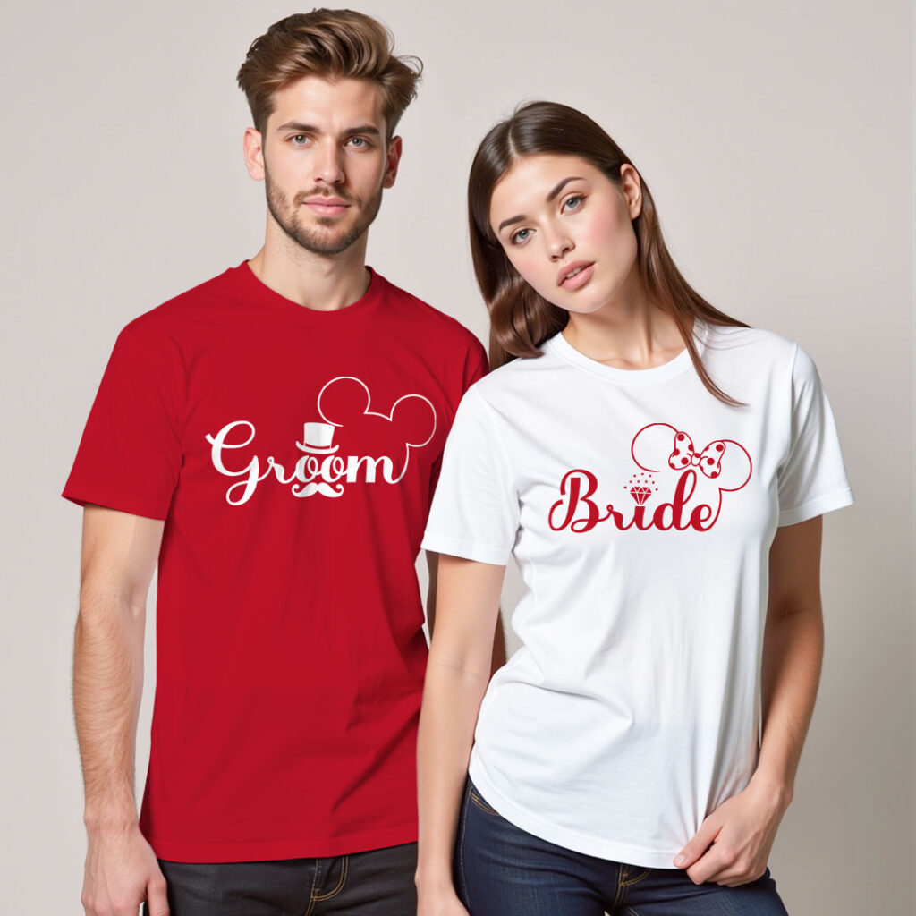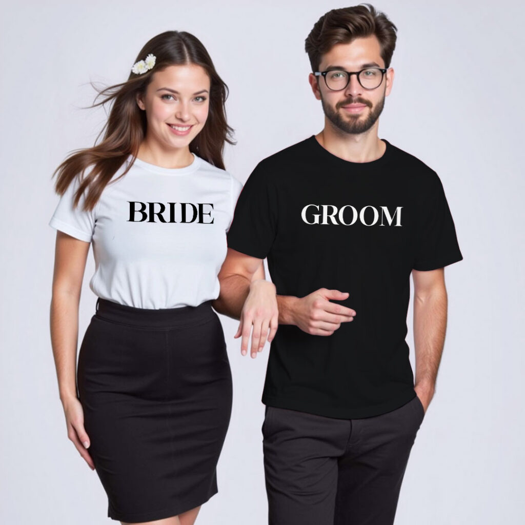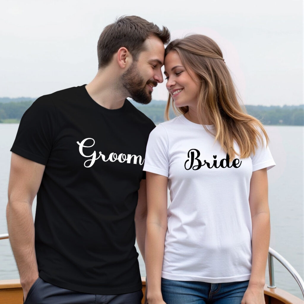 High-quality custom printed Bride and Groom t-shirts. Comfortable Cotton Designs perfect for Honeymoon Travel, Airport outfits, and Newlywed Life.