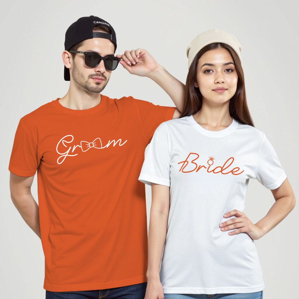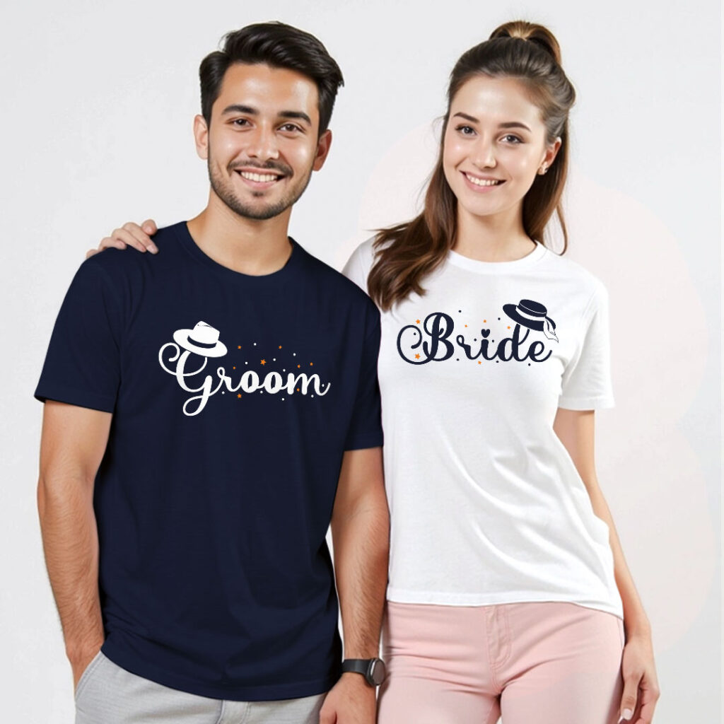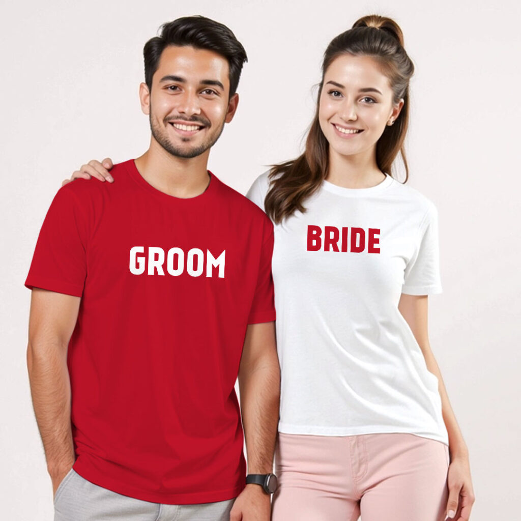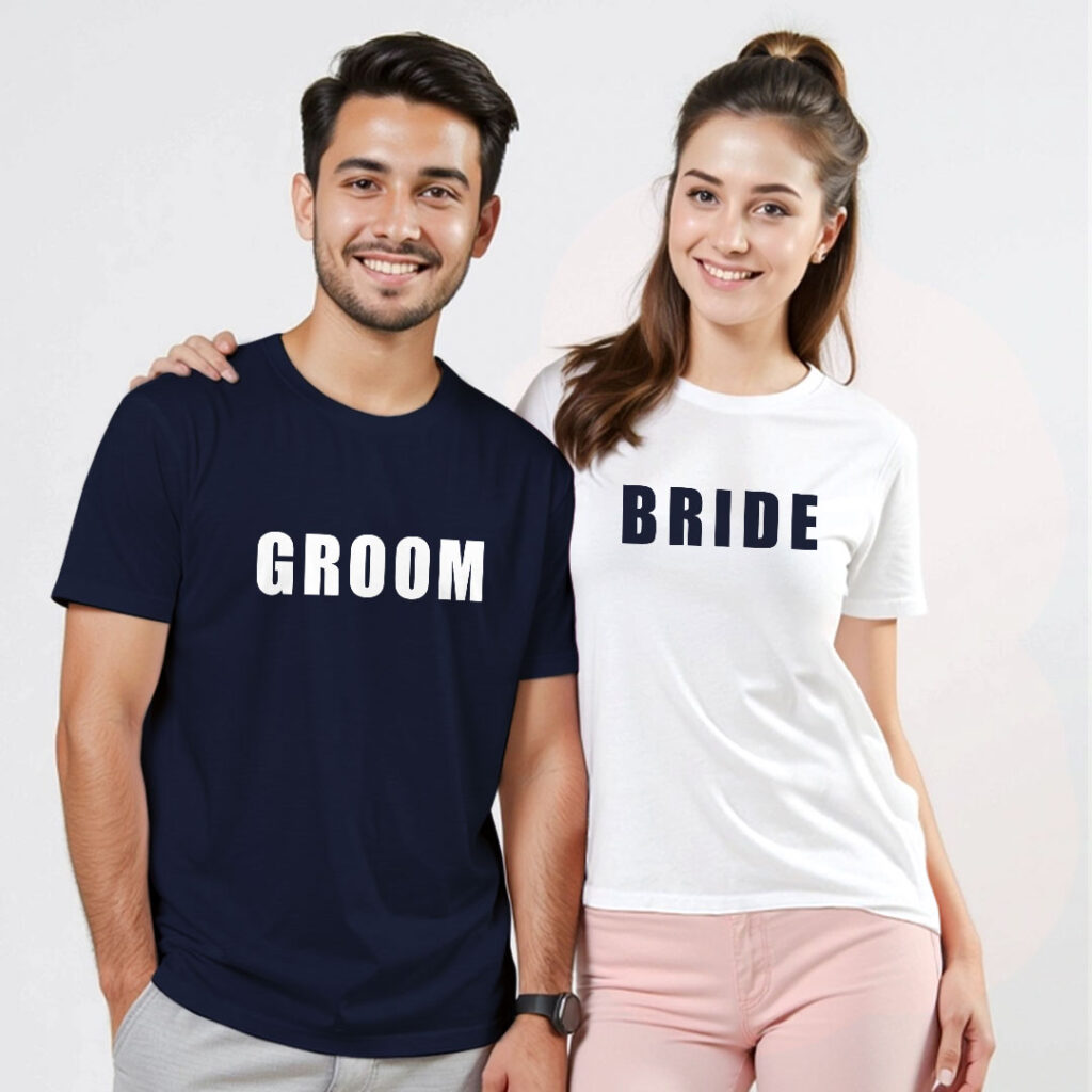 High-quality custom printed Bride and Groom t-shirts. Comfortable Cotton Designs perfect for Honeymoon Travel, Airport outfits, and Newlywed Life.