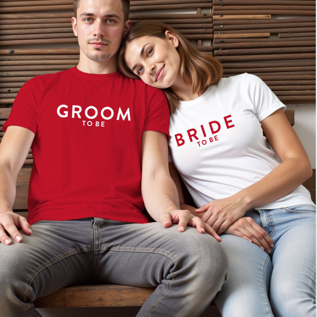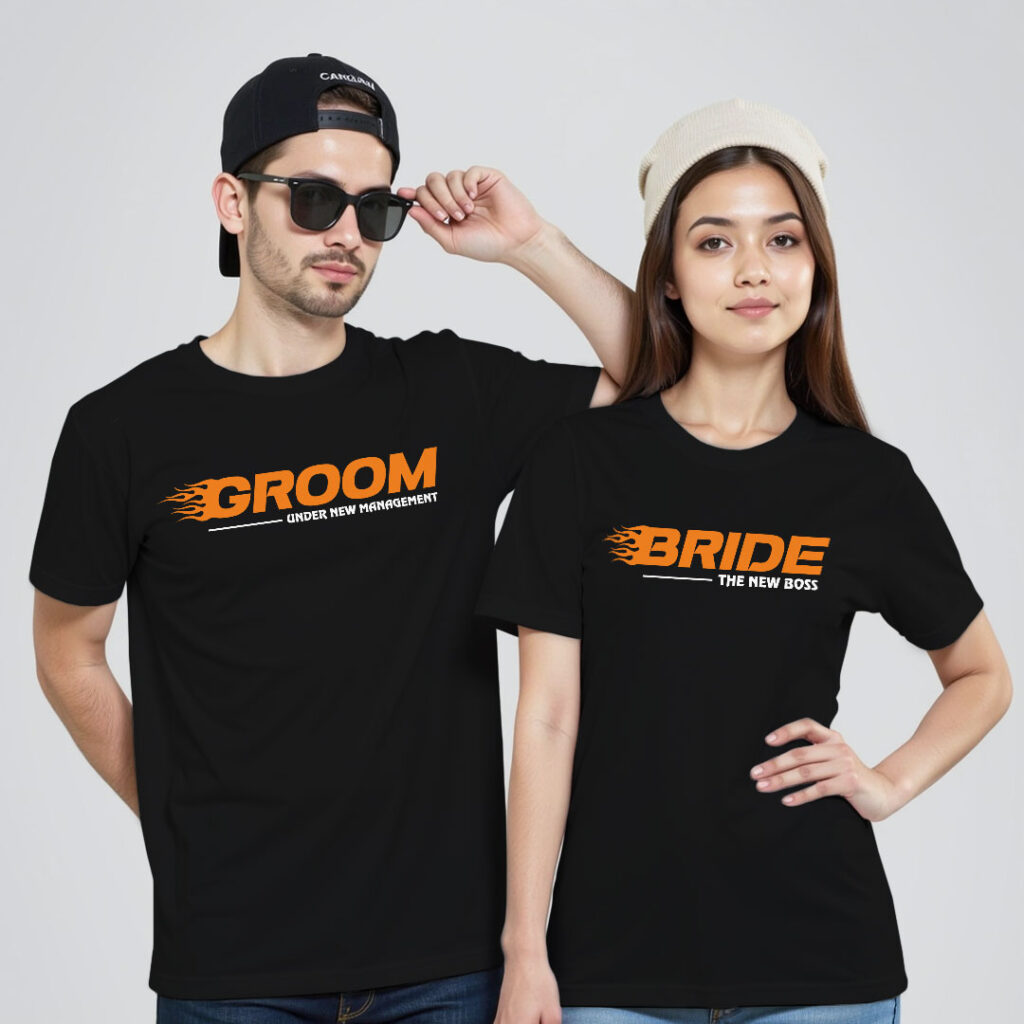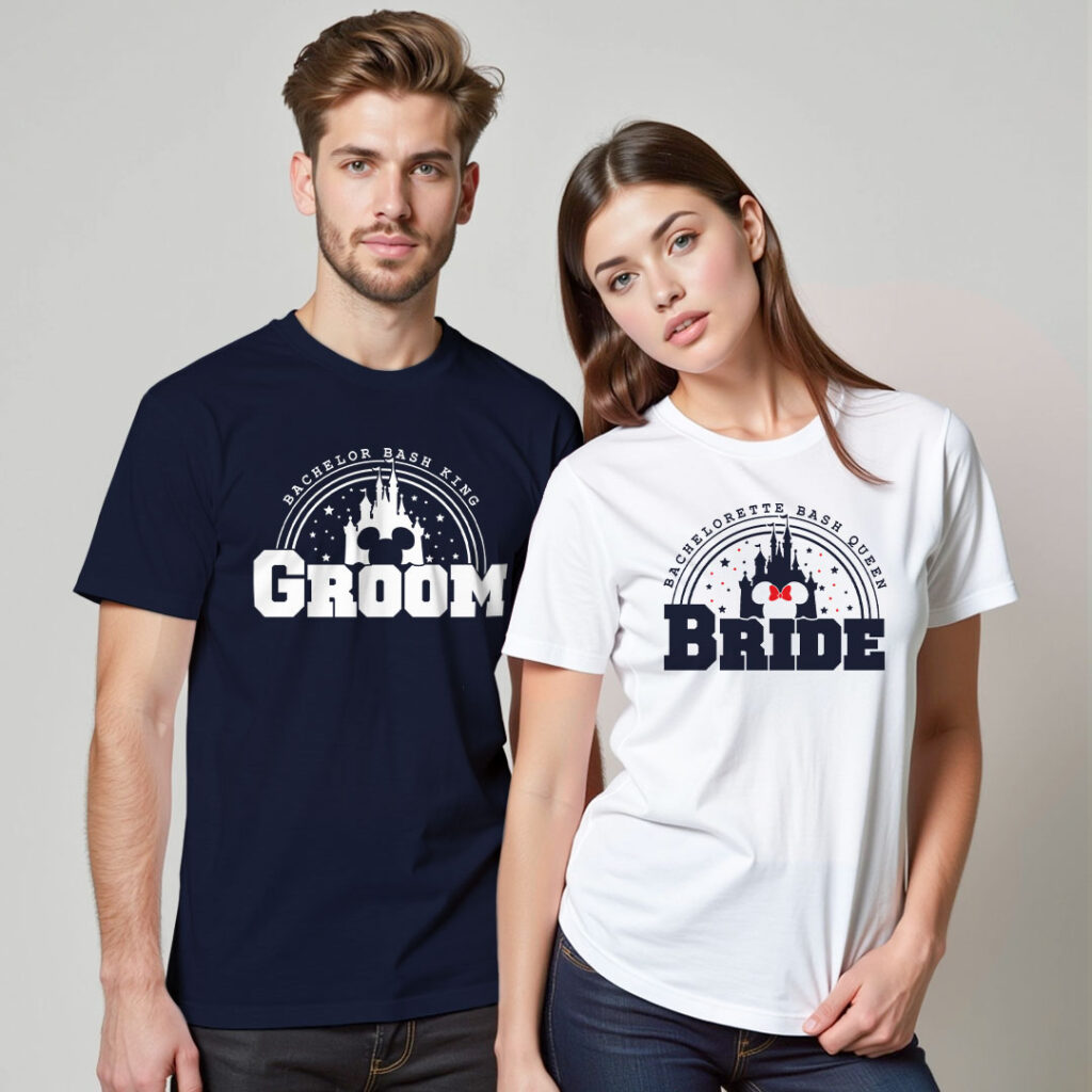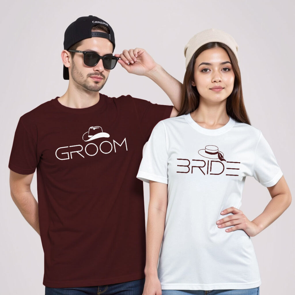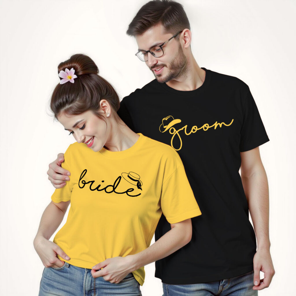 High-quality custom printed Bride and Groom t-shirts. Comfortable Cotton Designs perfect for Honeymoon Travel, Airport outfits, and Newlywed Life.