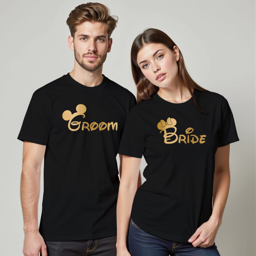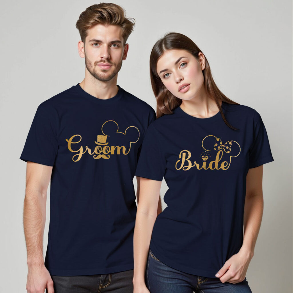 Micky Themed Groom Bride Gold Printed Wedding T-shirt