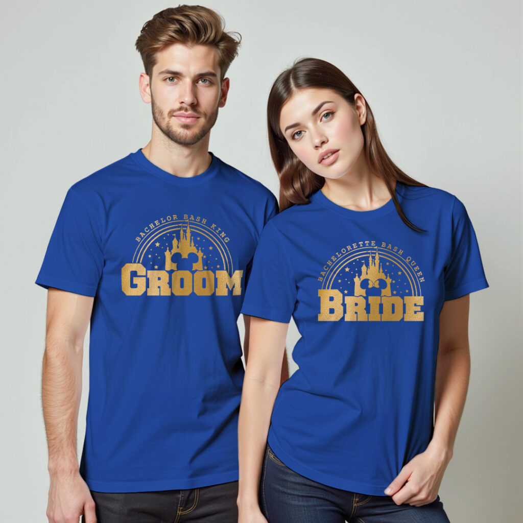 Groom Bride with Castle Gold Printed Wedding T-shirt