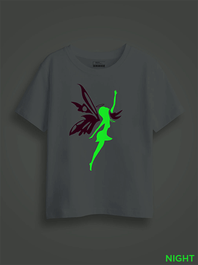 This T-shirt absorbs light during the day and emits it at night. The print on the T-shirt will also charge in sunlight or Tubelight and Glow in Dark in the dark. The duration of the Glow in Dark depends on the amount of light absorbed by the print