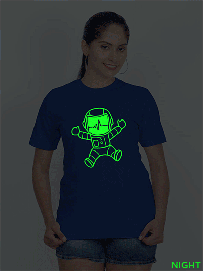 This T-shirt Print absorbs light during the day and emits it at night. The print on the T-shirt will also charge in sunlight or Tubelight and glow in the dark. The duration of the glow depends on the amount of light absorbed by the print
