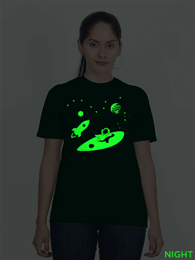 This T-shirt Print absorbs light during the day and emits it at night. The print on the T-shirt will also charge in sunlight or Tubelight and glow in the dark. The duration of the glow depends on the amount of light absorbed by the print