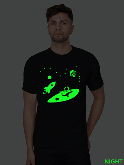 This T-shirt Print absorbs light during the day and emits it at night. The print on the T-shirt will also charge in sunlight or Tubelight and glow in the dark. The duration of the glow depends on the amount of light absorbed by the print