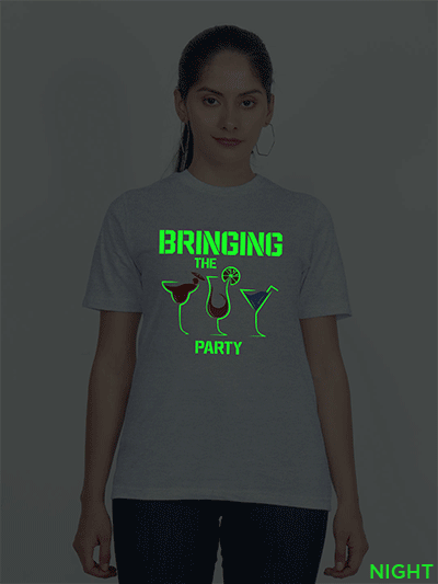 The Night Glow T-shirt features a unique print that absorbs light and creates a vibrant glow effect visible in the dark. It charges through exposure to light sources like sunlight, tubelights, or artificial lighting. After charging, the glow shines brightly in low-light settings, making the T-shirt both fun and functional. Whether you wear it for casual outings or evening adventures, this T-shirt ensures you catch attention effortlessly.