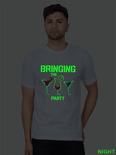 The Night Glow T-shirt features a unique print that absorbs light and creates a vibrant glow effect visible in the dark. It charges through exposure to light sources like sunlight, tubelights, or artificial lighting. After charging, the glow shines brightly in low-light settings, making the T-shirt both fun and functional. Whether you wear it for casual outings or evening adventures, this T-shirt ensures you catch attention effortlessly.