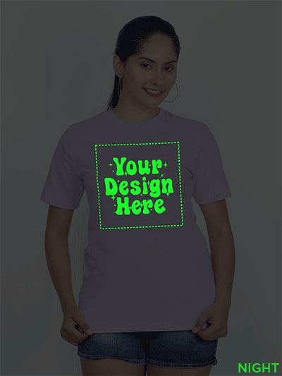 This T-shirt absorbs light during the day and emits it at night. The print on the T-shirt will also charge in sunlight or Tubelight and glow in the dark. The duration of the glow depends on the amount of light absorbed by the print