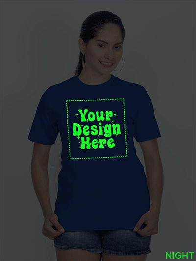 This T-shirt absorbs light during the day and emits it at night. The print on the T-shirt will also charge in sunlight or Tubelight and glow in the dark. The duration of the glow depends on the amount of light absorbed by the print
