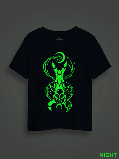 The glow-in-the-dark print on the Tshirt works similarly to radium. It absorbs light from any light source whether it’s sunlight, a tubelight, or artificial lighting and stores it. Once charged, the print will glow in the dark. Sunlight is particularly effective for charging, making the glow brighter and longer-lasting in the dark. Simply place the Tshirt in a well-lit area to activate the glow effect. For know more about this Print type You can can check out this post link Glow in dark Print or for Videos click here.?& for Customer’s Shared Photos or Our Gallery Pagespan>?