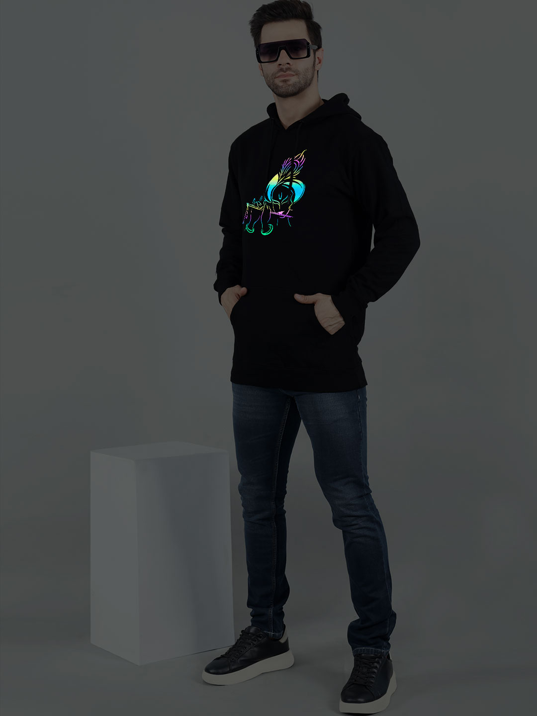 Rainbow Reflective Print reflect light, During light hits the print. Best for Party wear and Highway in Night or Day. During Vehicle Light Hits the Print. Hoodie will be Glow in Rainbow Effect