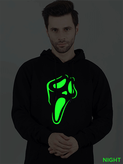 This Hoodie Print absorbs light during the day and emits it at night. The print on the Hoodie will also charge in sunlight or Tubelight and glow in the dark. The duration of the glow depends on the amount of light absorbed by the print