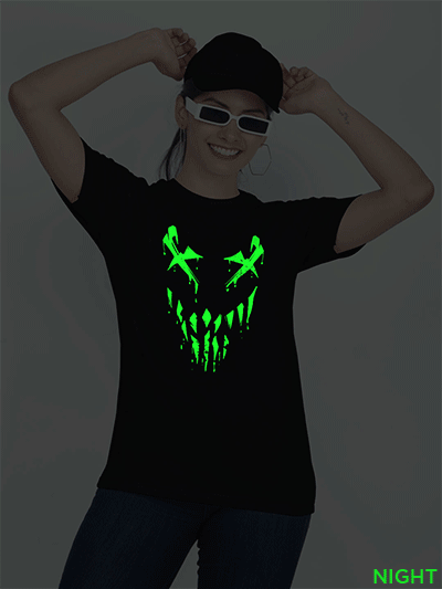 This T-shirt Print absorbs light during the day and emits it at night. The print on the T-shirt will also charge in sunlight or Tubelight and glow in the dark. The duration of the glow depends on the amount of light absorbed by the print