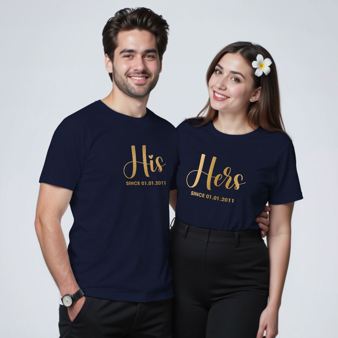 Celebrate your bond in style with the His and Her Since Custom Gold Printed Couple T-shirt. The Metallic Gold Effect Print offers a premium, luxurious look that helps you and your partner stand out with elegance. Its rich gold finish adds a classy, high-end feel ? rarely seen in everyday couple wear.
