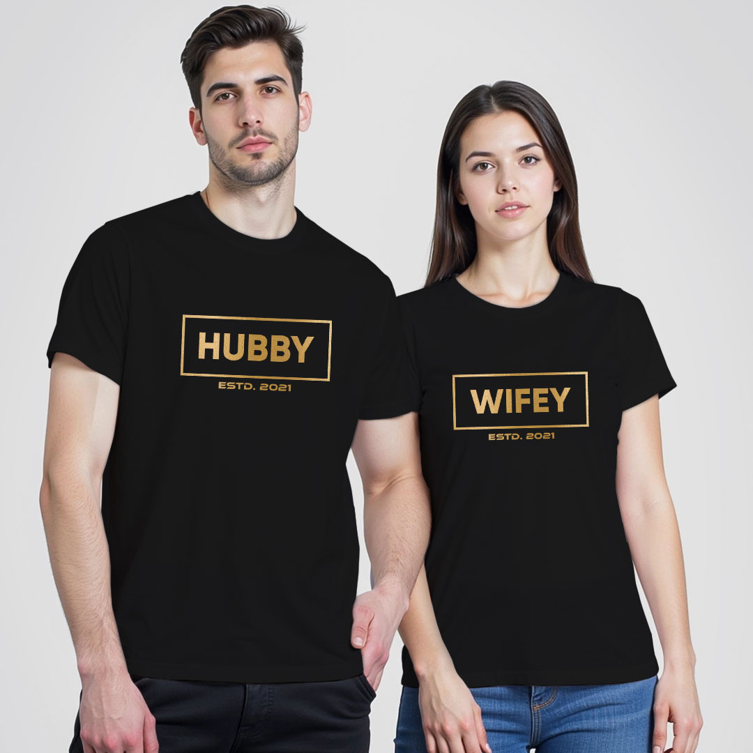 Celebrate your bond in style with the Hubby Wifey Est. Custom Gold Printed Couple T-shirt. The Metallic Gold Effect Print offers a premium, luxurious look that helps you and your partner stand out with elegance. Its rich gold finish adds a classy, high-end feel ? rarely seen in everyday couple wear.