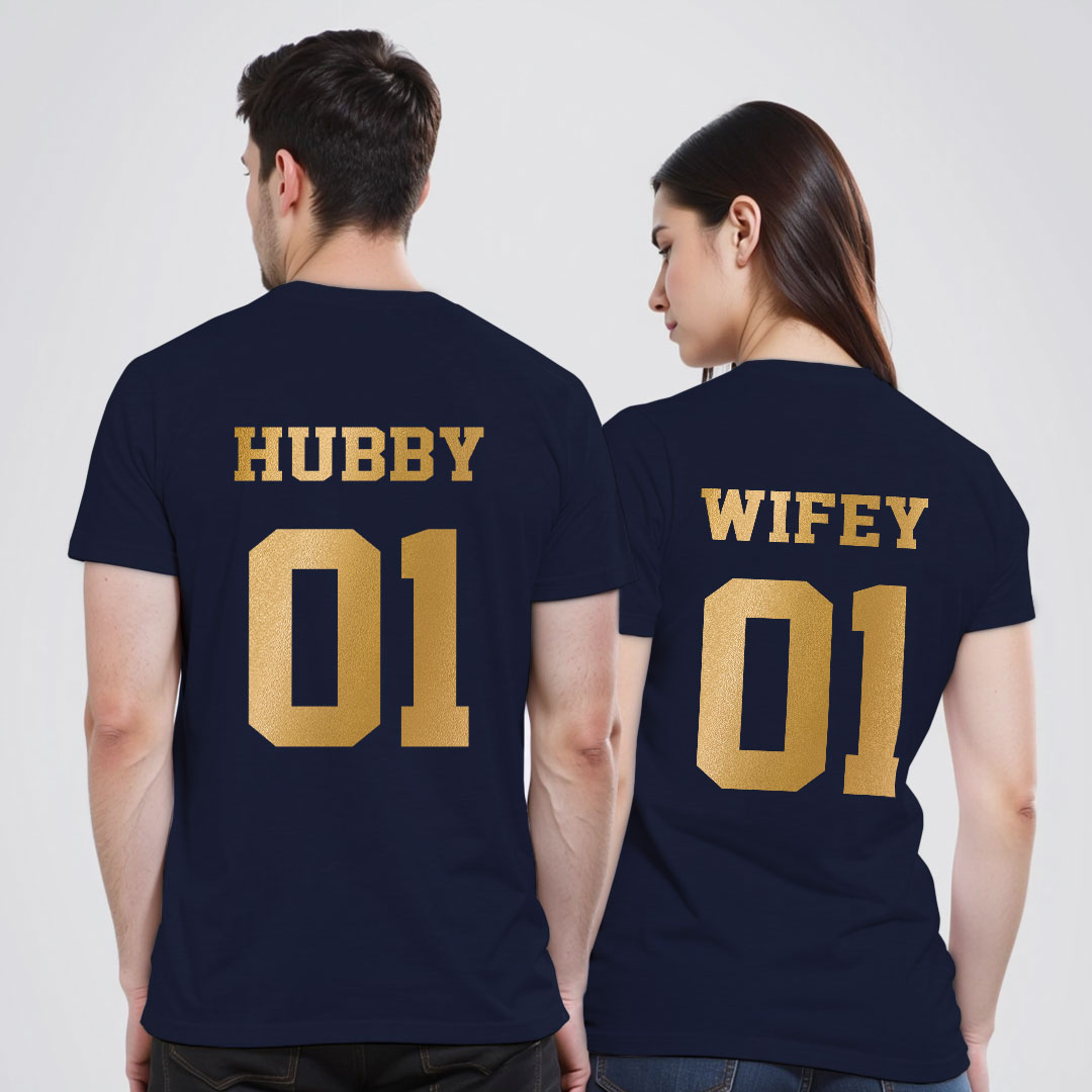 Celebrate your bond in style with the Hubby Wifey Gold Printed Couple T-shirt. The Metallic Gold Effect Print offers a premium, luxurious look that helps you and your partner stand out with elegance. Its rich gold finish adds a classy, high-end feel ? rarely seen in everyday couple wear.