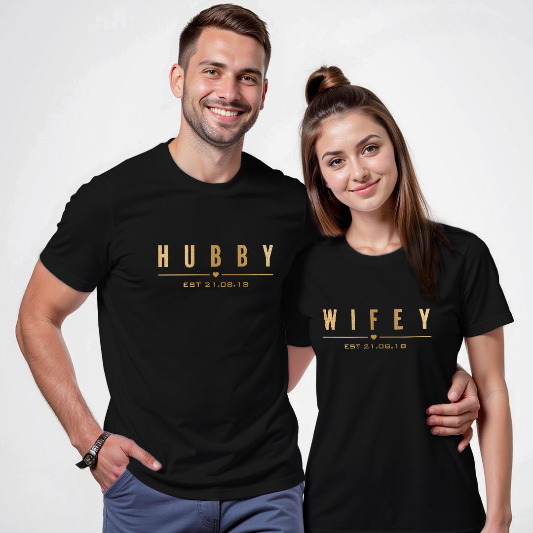 Celebrate your bond in style with the Hubby Wifey Gold Printed Couple T-shirt. The Metallic Gold Effect Print offers a premium, luxurious look that helps you and your partner stand out with elegance. Its rich gold finish adds a classy, high-end feel ? rarely seen in everyday couple wear.