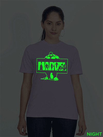 This T-shirt Print absorbs light during the day and emits it at night. The print on the T-shirt will also charge in sunlight or Tubelight and glow in the dark. The duration of the glow depends on the amount of light absorbed by the print