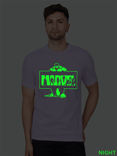 This T-shirt Print absorbs light during the day and emits it at night. The print on the T-shirt will also charge in sunlight or Tubelight and glow in the dark. The duration of the glow depends on the amount of light absorbed by the print
