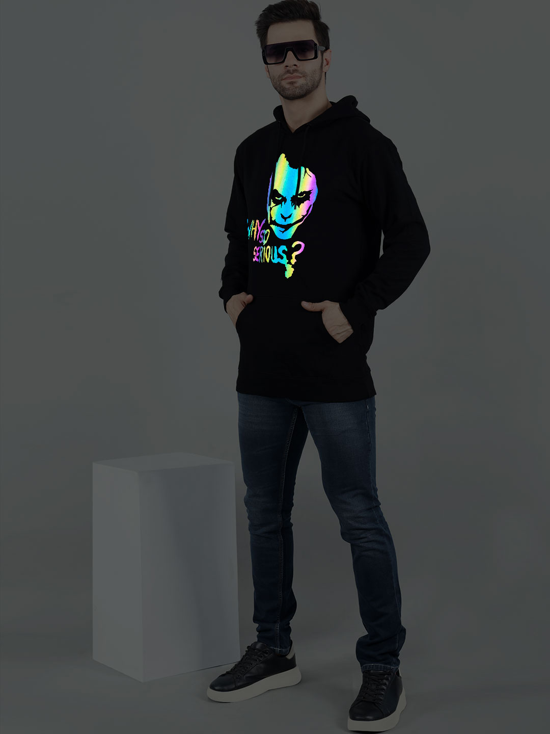 Rainbow Reflective Print reflect light, During light hits the print. Best for Party wear and Highway in Night or Day. During Vehicle Light Hits the Print. Hoodie will be Glow in Rainbow Effect