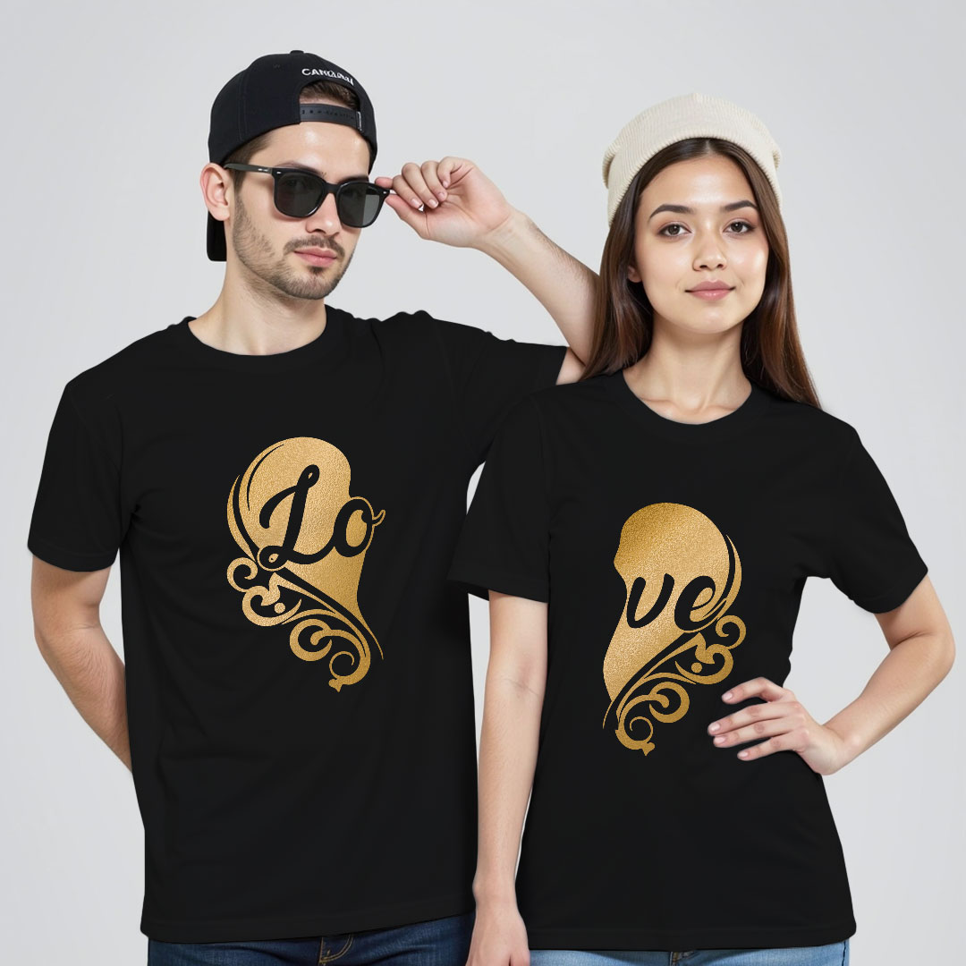Celebrate your bond in style with the Love Heart Gold Printed Couple T-shirt. The Metallic Gold Effect Print offers a premium, luxurious look that helps you and your partner stand out with elegance. Its rich gold finish adds a classy, high-end feel ? rarely seen in everyday couple wear.
