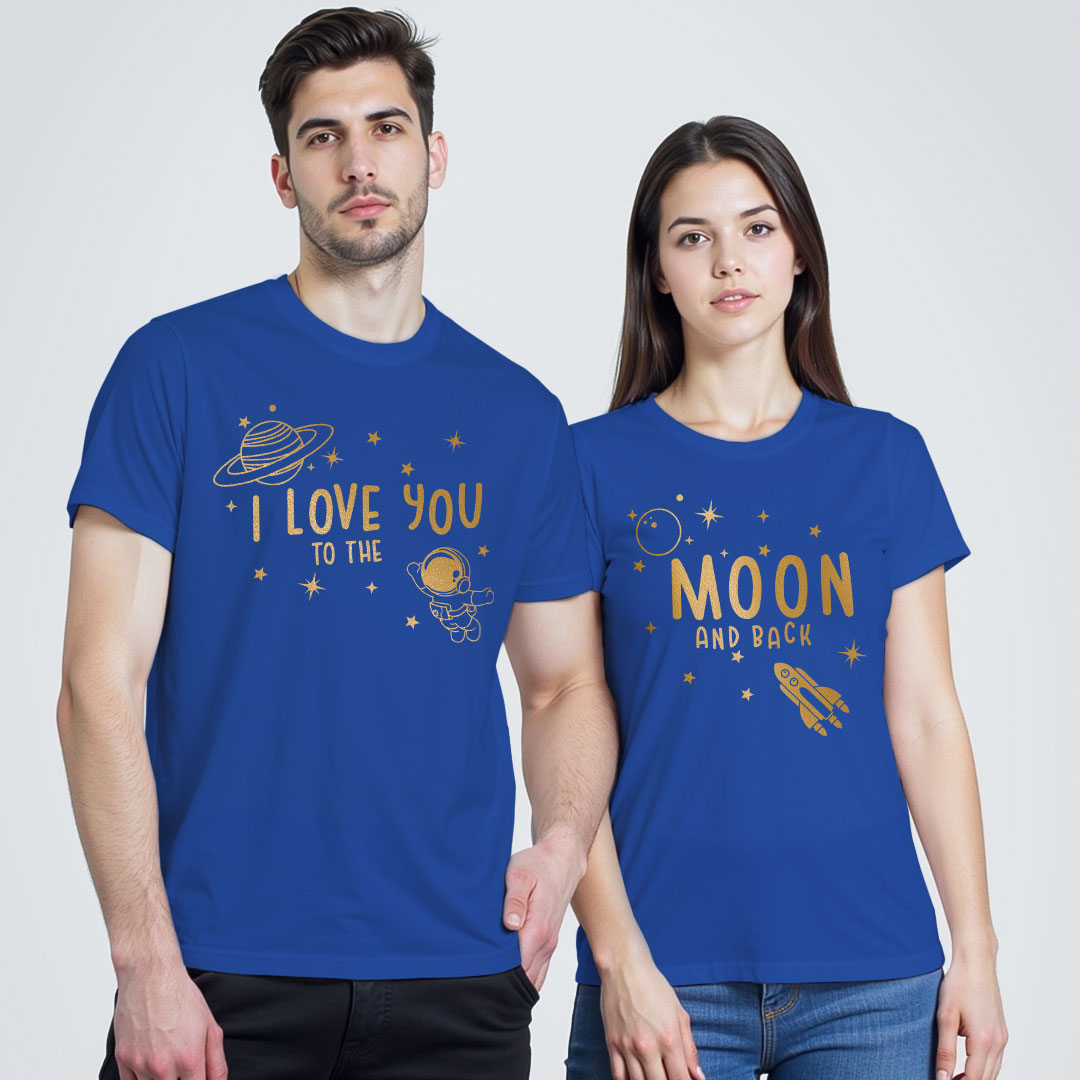 Celebrate your bond in style with the Love you to the Moon Gold Printed Couple T-shirt. The Metallic Gold Effect Print offers a premium, luxurious look that helps you and your partner stand out with elegance. Its rich gold finish adds a classy, high-end feel ? rarely seen in everyday couple wear.