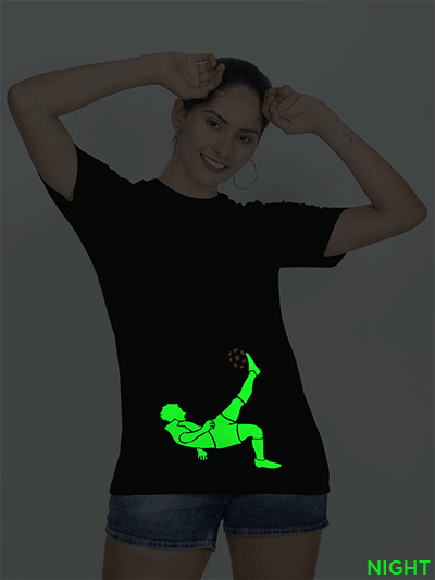This T-shirt Print absorbs light during the day and emits it at night. The print on the T-shirt will also charge in sunlight or Tubelight and glow in the dark. The duration of the glow depends on the amount of light absorbed by the print