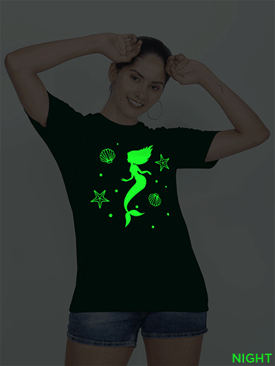 This T-shirt Print absorbs light during the day and emits it at night. The print on the T-shirt will also charge in sunlight or Tubelight and glow in the dark. The duration of the glow depends on the amount of light absorbed by the print