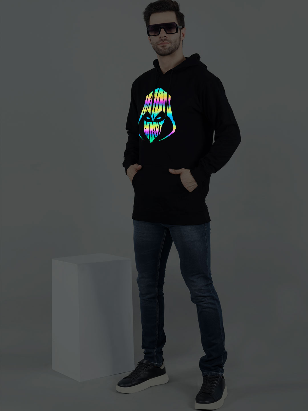 Rainbow Reflective Print reflect light, During light hits the print. Best for Party wear and Highway in Night or Day. During Vehicle Light Hits the Print. Hoodie will be Glow in Rainbow Effect
