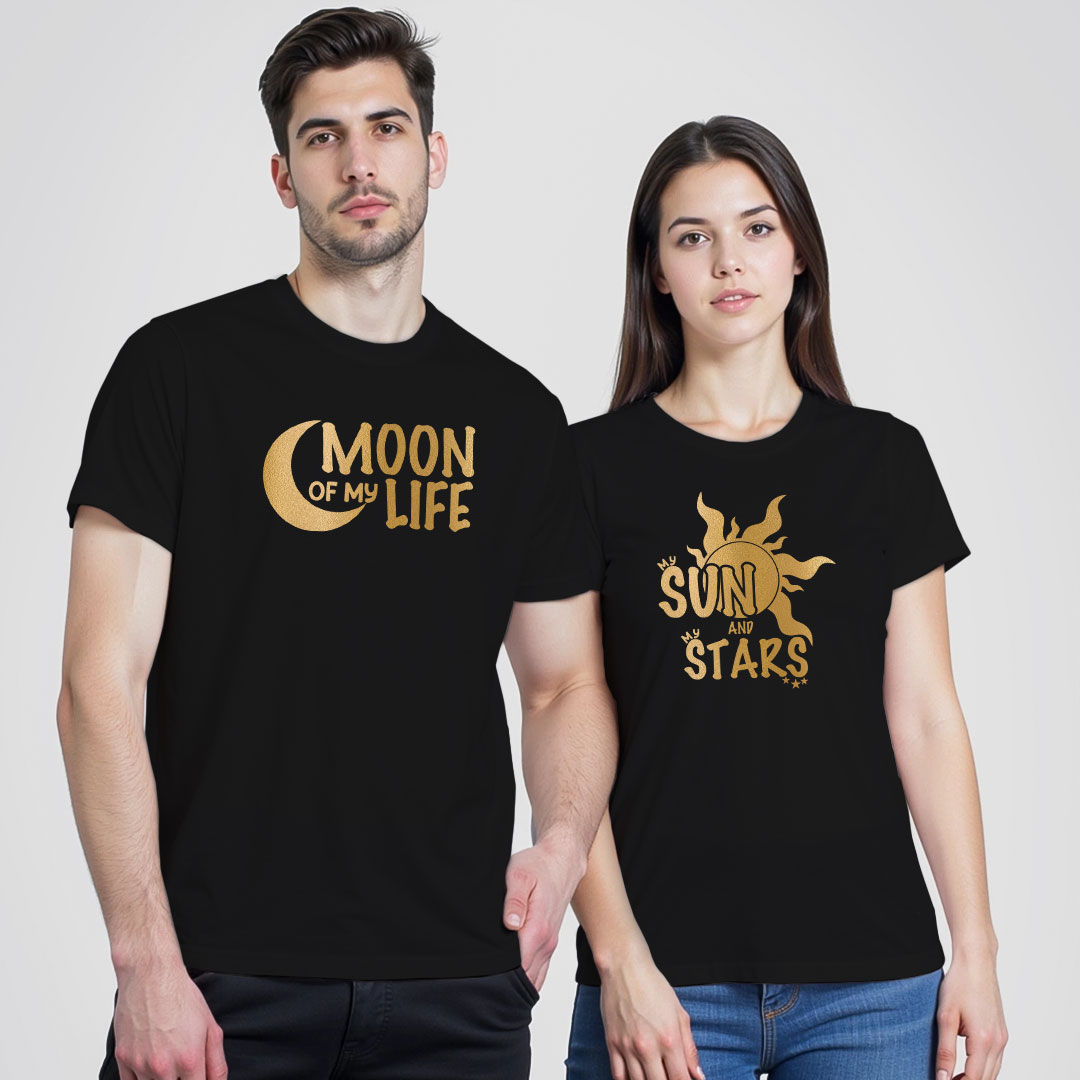Celebrate your bond in style with the Moon of my Life Gold Printed Couple T-shirt. The Metallic Gold Effect Print offers a premium, luxurious look that helps you and your partner stand out with elegance. Its rich gold finish adds a classy, high-end feel ? rarely seen in everyday couple wear.