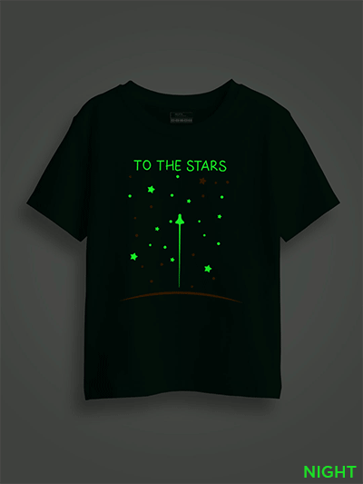 This T-shirt absorbs light during the day and emits it at night. The print on the T-shirt will also charge in sunlight or Tubelight and Glow in Dark in the dark. The duration of the Glow in Dark depends on the amount of light absorbed by the print