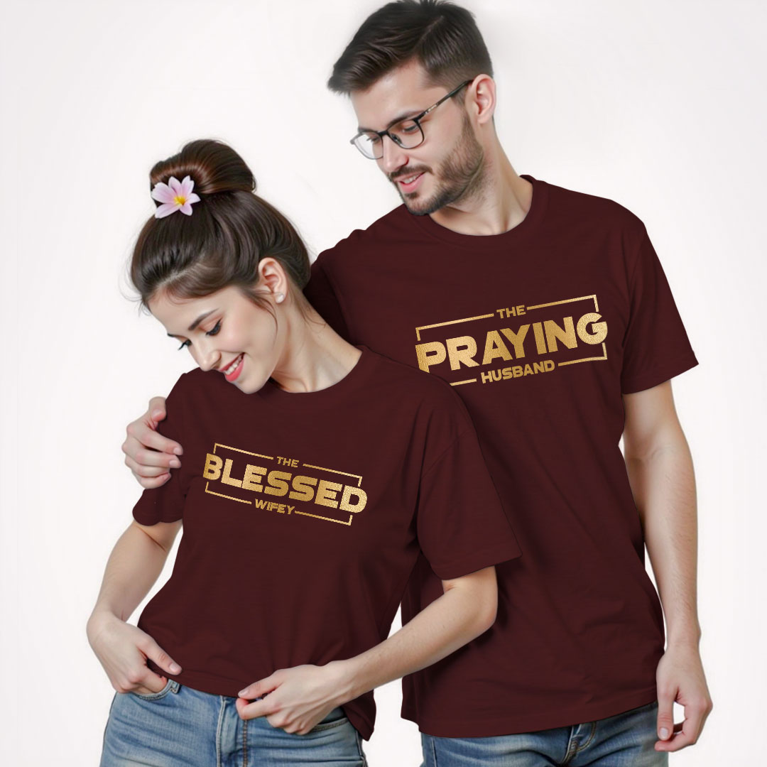 Praying Husband Blessed Wife Gold Printed Couple T-shirt