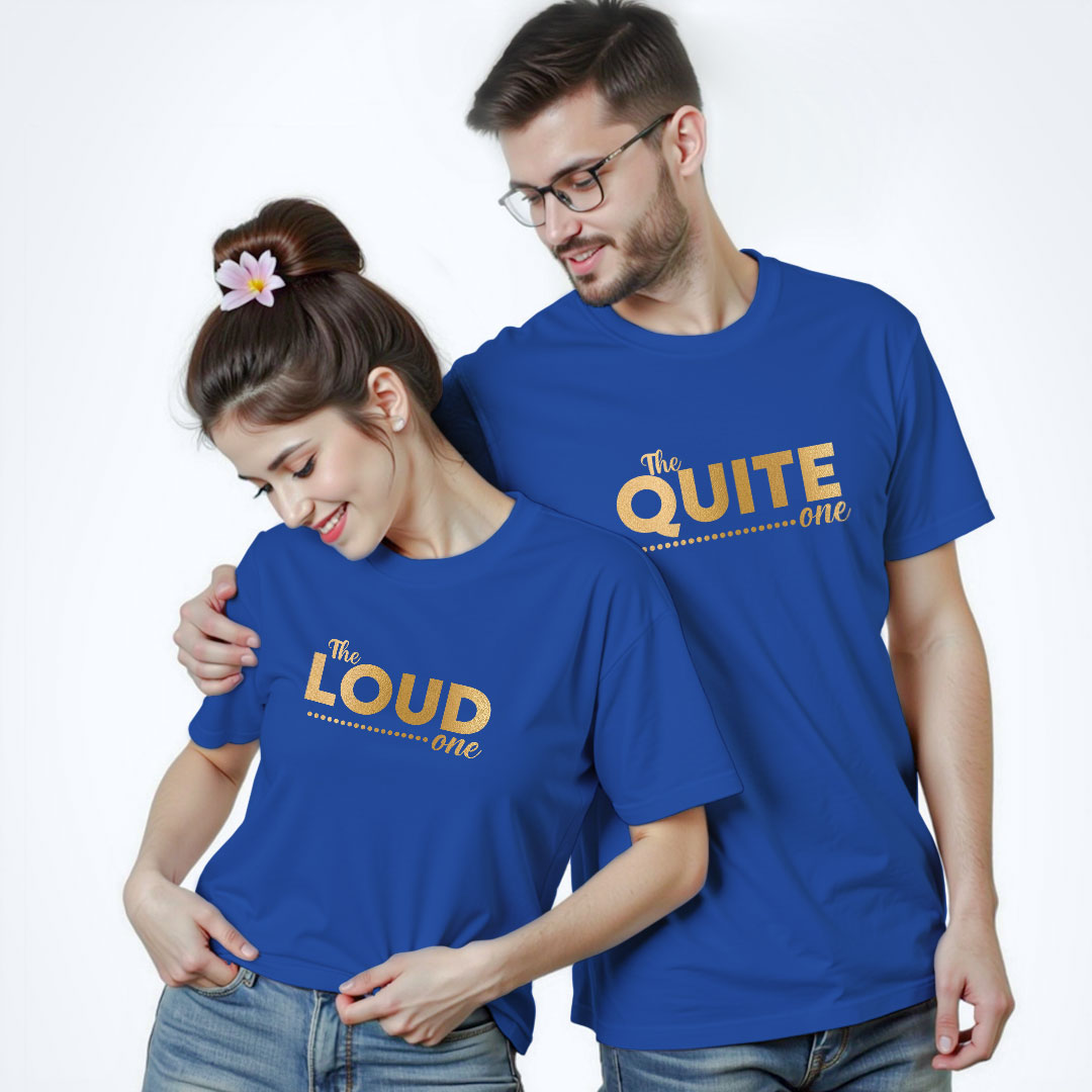 Celebrate your bond in style with the Quite one Loud one Gold Printed Couple T-shirt. The Metallic Gold Effect Print offers a premium, luxurious look that helps you and your partner stand out with elegance. Its rich gold finish adds a classy, high-end feel ? rarely seen in everyday couple wear.