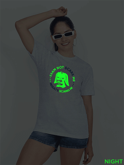 This T-shirt Print absorbs light during the day and emits it at night. The print on the T-shirt will also charge in sunlight or Tubelight and glow in the dark. The duration of the glow depends on the amount of light absorbed by the print