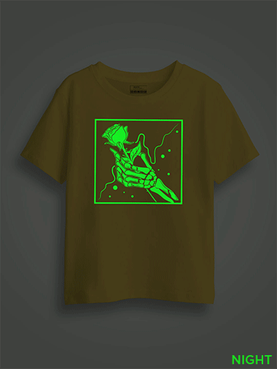 The glow-in-the-dark print on the Tshirt works similarly to radium. It absorbs light from any light source whether it’s sunlight, a tubelight, or artificial lighting and stores it. Once charged, the print will glow in the dark. Sunlight is particularly effective for charging, making the glow brighter and longer-lasting in the dark. Simply place the Tshirt in a well-lit area to activate the glow effect. For know more about this Print type You can can check out this post link Glow in dark Print or for Videos click here.?& for Customer’s Shared Photos or Our Gallery Pagespan>?