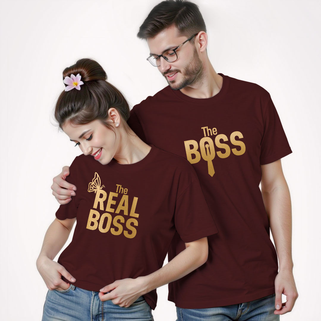 Celebrate your bond in style with the The Boss & Real Boss Gold Printed Couple T-shirt. The Metallic Gold Effect Print offers a premium, luxurious look that helps you and your partner stand out with elegance. Its rich gold finish adds a classy, high-end feel ? rarely seen in everyday couple wear.