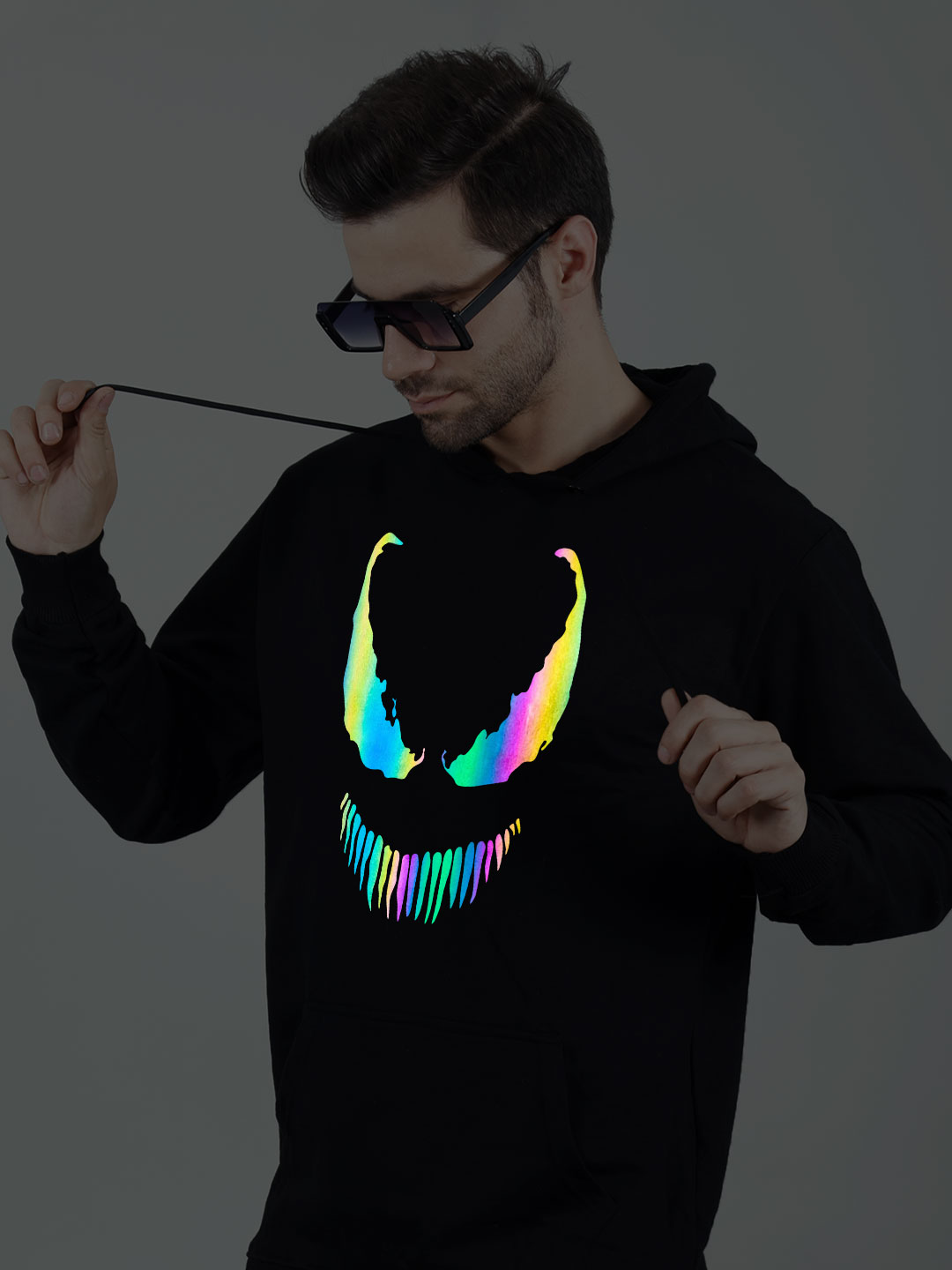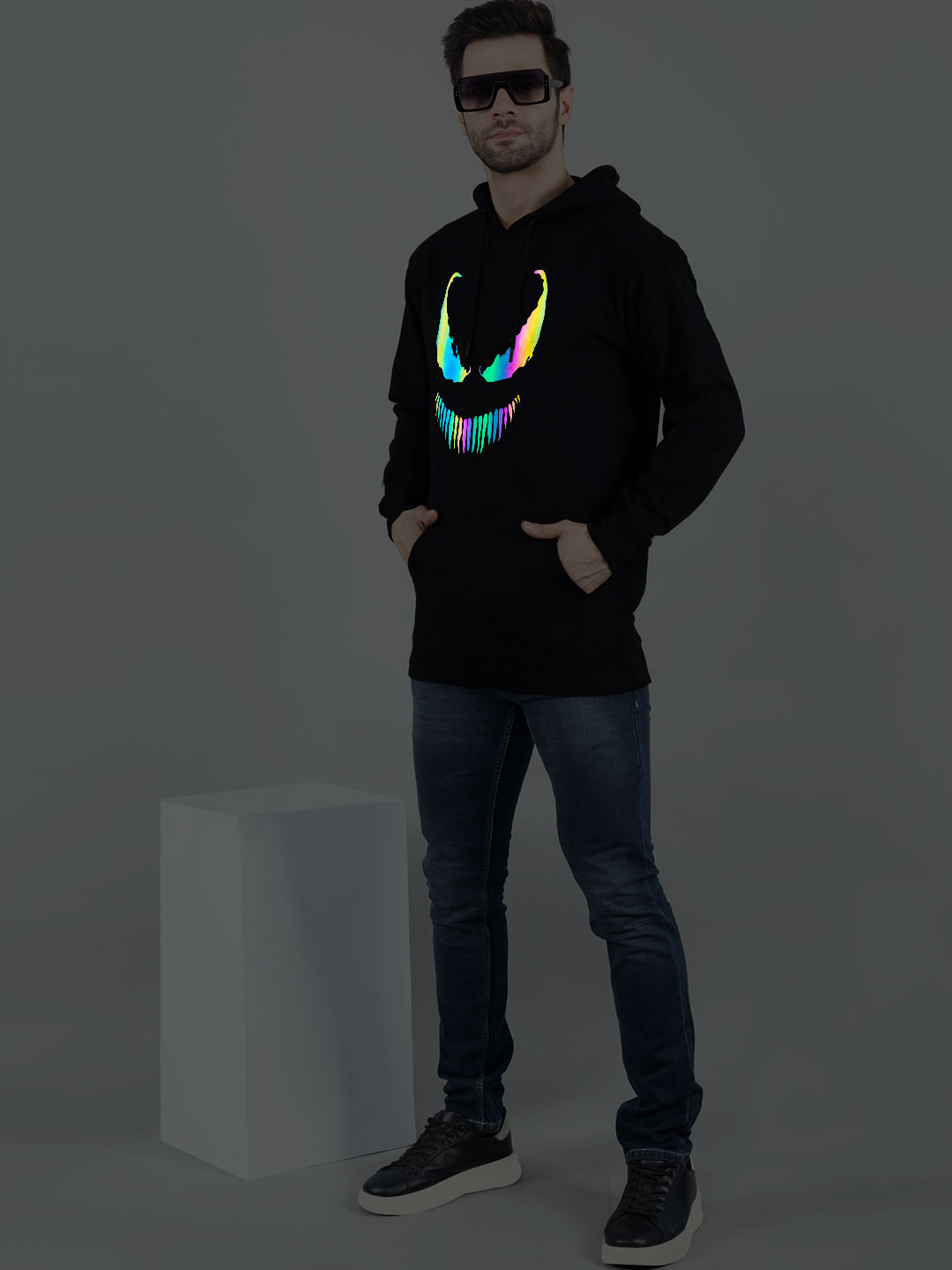Rainbow Reflective Print reflect light, During light hits the print. Best for Party wear and Highway in Night or Day. During Vehicle Light Hits the Print. Hoodie will be Glow in Rainbow Effect